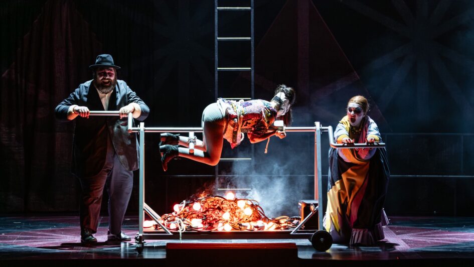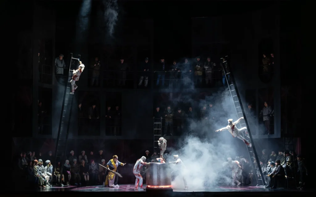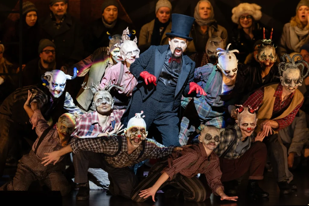 Pro uznávaného režiséra Barrieho Koskyho je fantaskní opera Nikolaje Rimského-Korsakova ideální látkou – takovou, která přirozeně probouzí jeho představivost a cit pro divadelní nadsázku. Připomeňme, že Příběh vánoční noci nemá nic společného s betlémským příběhem, ale vychází ze zimního slunovratu, z času, kdy se noc prodlužuje a temné, magické síly nabývají na moci. Kosky vypráví příběh jako „divadlo na divadle“: vesnická komunita sama inscenuje pohádku v chudé cirkusové manéži, jejímž démonickým principálem je sám ďábel. Scéna Klause Grünberga v podobě vícepodlažního půlkruhu, oscilujícího mezi arénou a rozpadající se fasádou domu, nabízí funkční a přehledný rámec pro pohádkové dění. Kostýmy Klause Brunse kombinují šedou každodennost vesnických postav (vč. Vakuly) s pestrými, satiricky přehnanými kostýmy rázovitých vedlejších postav. Výraznou energii dodává inscenaci také technicky dokonalá a nesmírně vtipná a nápaditá choreografie Otty Pichlera – taneční a akrobatické výstupy vnášejí do dění rytmus, lehkost a jiskru. Skutečné scénické crescendo však přichází až po přestávce: efektní obrazy, záměrný kýč, ďábelský balet i triumfálně opulentní nástup carevny vytvářejí přesně ten druh bláznivé, pohádkově-parodické podívané, kterou si diváci s Koskyho týmem právem spojují.