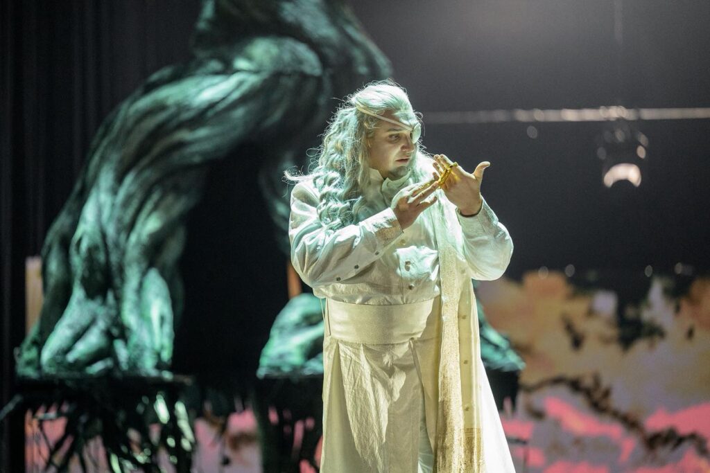 Režisérka Sláva Daubnerová se svým tvůrčím týmem pojímá Zlato Rýna jako obraz zrodu nového života či světa, jenž je vzápětí kontaminován touhou po moci, symbolizovanou prstenem, který si Alberich ukoval ze zlata uloupeného rýnským dcerám. Scéně Borise Kudličky a Kateřiny Hubené po celou dobu dominuje strom života (Lebensbaum), jenž sice vytváří působivý, majestátní vstup do inscenačního konceptu celého Prstenu, v průběhu jeho předvečera však zůstává spíše statickým symbolem — neustále přítomnou, avšak dramaturgicky málo rozvíjenou připomínkou základního tématu díla. Myšlence ideového konceptu sice nechybí jistá invenčnost, její scénické provedení však může u diváka méně obeznámeného s libretem vyvolat interpretační nejasnosti: role rýnských dcer se místy nebezpečně blíží jakési ochranářské či „arboristické“ funkci a zlato, ústřední motiv celého Prstenu Nibelungova, tak paradoxně působí dojmem, jako by nevycházelo z řeky, nýbrž „rostlo na stromě“. Režisérka se zjevně snaží hledat pro jednotlivé postavy i situace originální inscenační klíč, výsledný efekt je však — řečeno korektně — spíše průměrný. Namísto důsledné práce s textem a vedení interpretů k postupnému rozvíjení charakterů a jejich vzájemných vztahů se inscenace často uchyluje k popisně povrchním prostředkům. Daubnerová v inscenaci až příliš akcentuje výtvarnou složku, zejména kostýmy, jejichž nadměrná zdobnost a množství odvádí pozornost od samotného tématu. Vývoj postav, proměna jejich motivací i jednání tak není vždy dostatečně podpořena hereckou akcí a dramatickou interakcí, ale bývá naznačována spíše prostřednictvím vnějších, především kostýmních proměn, jako by nedůvěřovala schopnosti diváků porozumět, uplatnit vlastní fantazii a úsudek, ani interpretačnímu potenciálu pěvců. Mezi problematičtější prvky inscenace patří i choreografické výstupy (tvůrce Ermanno Sbezzo), které např. v tanečním čísle Erdy či bezúčelného poskakování dělníků v Nibelheimu — zůstávají na úrovni povrchní ilustrace bez výraznějšího významového ukotvení. Hudební složce Zlata není ponechán dostatečný prostor nést situaci samostatně a vizuální aparát je využíván až nad míru své funkční nezbytnosti. Ve scéně Nibelungů inscenátoři sice nabízejí zajímavý prvek video designu, vzápětí jej však nedokáží plně využít; bohatý potenciál vizuální složky zůstává nevyužitý a obraz působí velmi nevýrazně. Poslední moji výtku si zaslouží výjev, v němž se zlato vrství do výšky postavy bohyně mládí. Přestože jde o produkčně nákladné řešení, jeho výsledek nepřináší odpovídající účinek a výsledný obraz působí nepřesvědčivě a rozpačitě.